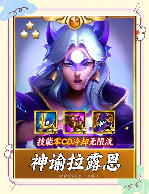 拉露恩:优先选取女神之泪、无用大棒、拳套,合成装备如蓝霸符(提升技能释放频率)、科技枪(提供吸血能力)、正义之手(增加输出或生存能力)。运营策略 前期过渡:可采用4夜幽+2神谕的过渡阵容,德莱厄斯可作为前期坦度担当。若拥有青龙刀,则推荐克格莫+狙神阵容过渡,因为二星克格莫的输出能力高于一星拉露恩。