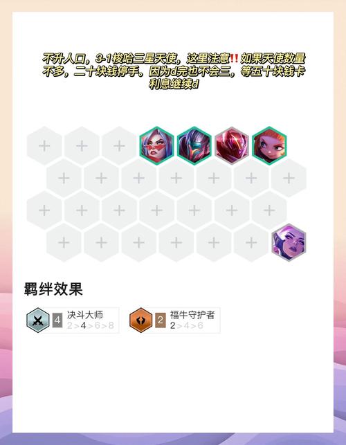〖Two〗、阵容推荐 羁绊组成:6决斗大师+3超级英雄。此阵容依赖于决斗大师的高攻速和超级英雄的额外属性加成。阵容前提:前期需顺利拿到决斗大师和超级英雄的相关卡牌,同时装备方面能合成飓风、轻语等物理输出装备。最关键的是要拿到天使(凯尔)的强化符文——登神长阶。