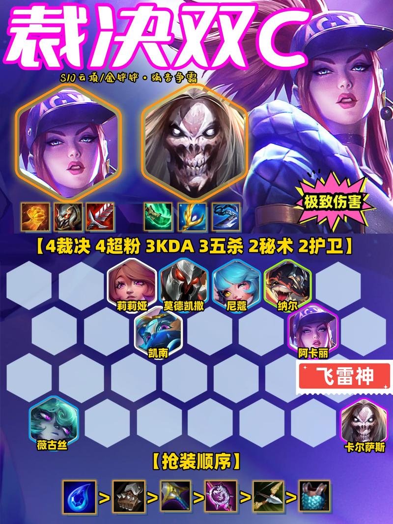 〖One〗、装备分配:莎弥拉主C,无尽、轻语、巨杀;腕豪主T,狂徒、板甲、救赎;薇古丝副C,青龙刀、法爆、巨杀。阵容解析:物理装备多时,可选取乡村莎米拉,乡村打工强度高,前期嫖卡,乡村天选时无脑拿,7人口慢D,三星三费卡即可。五杀拼多多阵容,5五杀、3超粉、4裁决、3KDA、2秘护、2护卫。