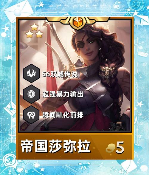 〖Six〗、《金铲铲之战》暴力流莎弥拉阵容搭配攻略如下: 核心英雄与装备: 主C莎弥拉:装备蓝buff实现永动减甲,配上无尽和巨杀实现暴力输出。吃名流和帝国增伤,没有肉装的英雄可以随便秒。 前排与辅助英雄: 日女:作为前排,拥有强大的护盾和双抗加持,是阵容中最肉的存在。