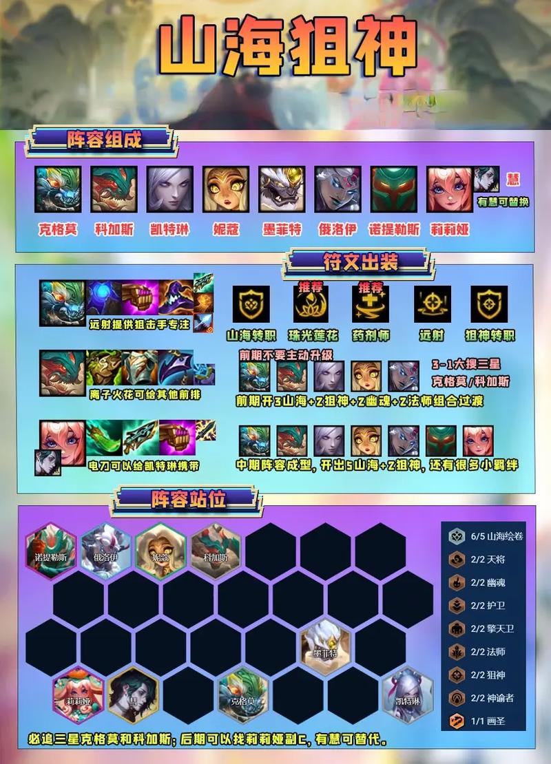 阵容组成:伊泽瑞尔(EZ)、基兰、辛吉德、艾克、萨勒芬妮、泽丽。7发明家2精密狙击神2极客。海克斯选取上,功能类推荐发明之心、自我修复、潘多拉的装备。战力类推荐直击弱点、后排迅、星界祝福。防御类则有神盾使、浪人、后排坚强。装备选取上,泽丽推荐水银(拳套、斗篷)和正义(拳套、水滴)。