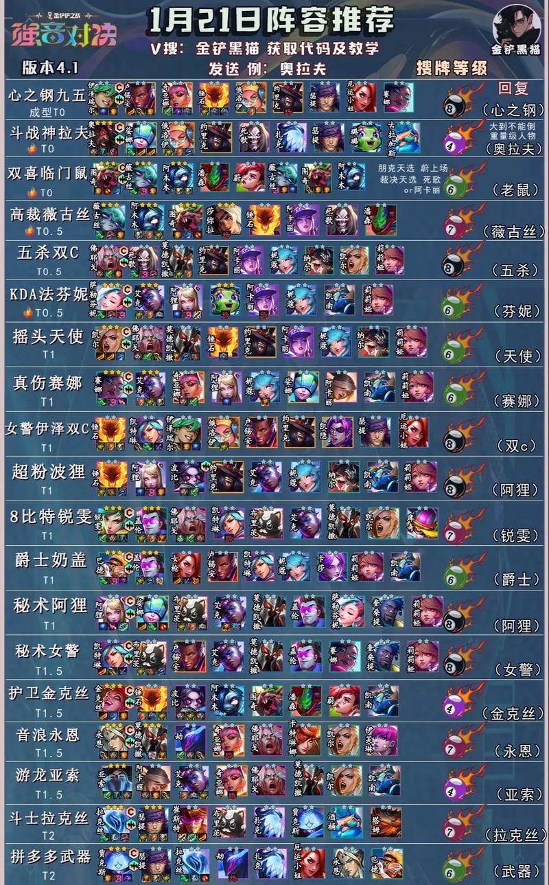 〖Four〗、饮血剑、泰坦坚决 - 羁绊:1吟游诗人、1龙神、1窃法秘手、4幽影龙、1冒险家、2驯龙大师、2格斗家、3法师、2秘术师 九星界索尔阵容:- 核心英雄:索尔 - 推荐装备:无尽、法爆、蓝霸符 - 羁绊:9星界龙、2格斗、1龙神 上面就是近来金铲铲之战的强势阵容推荐,希望对玩家们有所帮助。