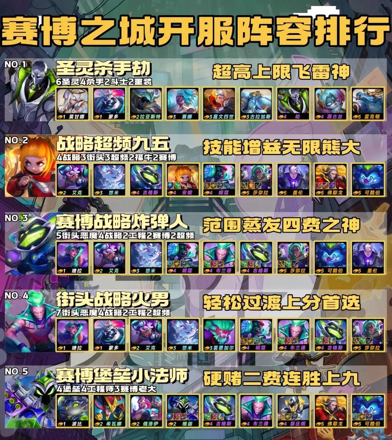 阵容介绍:泰隆、石傲玉等英雄组成,拥有5冒险家、3玉龙等羁绊。阵容分析:刺客冷门,易偷分,需注意对位。怒翼双C 阵容介绍:斯维因、霞等英雄,形成6怒翼龙、4换形师等羁绊。阵容分析:各分段强力吃鸡阵容,后期容错高,输出强。