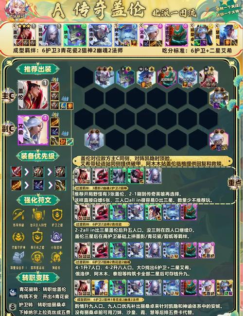 核心卡牌:1费卡盖伦,作为阵容的主坦和核心输出。辅助卡牌:伊泽瑞尔(EZ)、洛、杰斯、玛尔扎哈、雷欧娜、悠米(猫咪)、奎桑提、萨勒芬妮(酸辣粉)等,这些卡牌可以根据实际情况和对手的阵容进行灵活搭配。特殊考虑:如果有“学院转”职纹章,可以考虑给萨勒芬妮,以增强阵容的整体强度和灵活性。