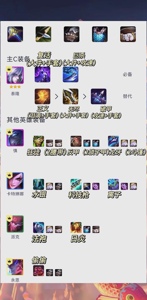 〖One〗、优先:刺客之徽、刺客之冕、快速思考。这些符文能显著提升刺客的输出能力和阵容成型速度。次选:阿福的百宝袋I、提亚马特、游牧者。这些符文有助于获取额外的装备和羁绊效果,提升阵容的整体实力。装备搭配 奥拉夫:必备刺客转职,搭配无尽之刃和疾射火炮,提升暴击伤害和攻击速度。