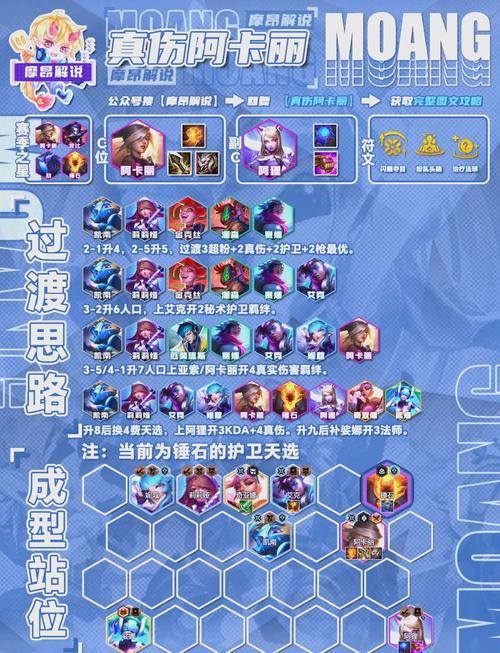 〖Three〗、装备选取:阿卡丽的核心装备是无尽之刃,用于提高爆发伤害。第三件装备可以选取科技枪或正义之手来增加续航。小丑作为副C,可以选取无尽、飓风和轻语来提高输出能力。艾克则推荐装备鬼书和辛迪加之心。阵容站位:非刺客英雄可以放在后排吸引仇恨,而刺客英雄则应靠近对方的C位进行输出。