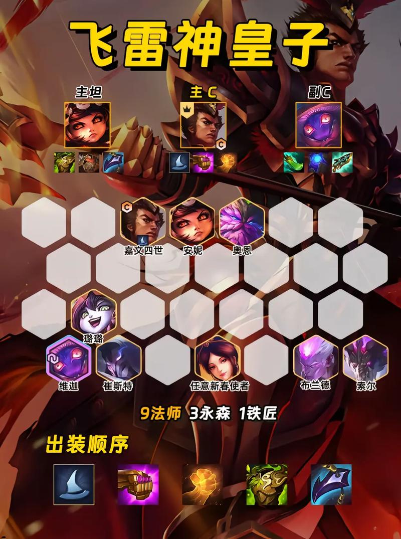 开局优先抢金铲铲,优先做皇子的魔法师转职。前期运营以盖伦、孙悟空、伊莉丝、皇子(三国猛将天选)为主,2-1拉4人口,2-5拉5人口。中期过渡阵容加入卡特、奈德丽、蔚,6人口时找到三星皇子&三星盖伦即可攒钱拉人口。后期成型阵容加入奥恩、璐璐、阿兹尔、维迦,组成最终羁绊,并注意站位,不要让皇子被集火。