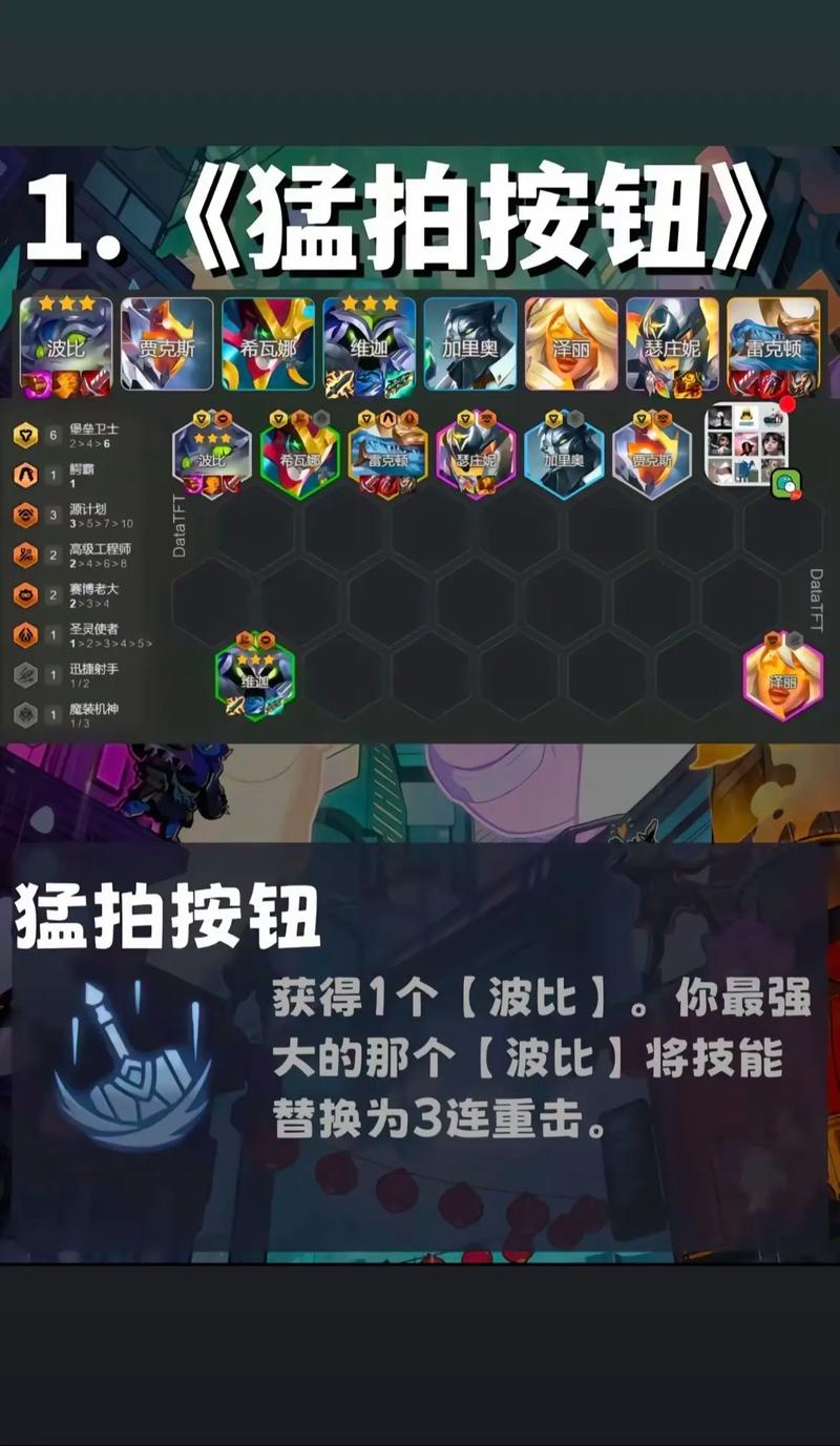 〖Three〗、爽点:☆☆☆视觉:☆☆☆强度:☆☆☆斗枪阵容不仅强度高,而且视觉效果和爽点也十分出色,是上分的不二之选。阵容羁绊搭配:斗枪阵容的羁绊搭配非常关键,主要包括1机器人、6斗士、2虚空、2狂野、2海克斯和2枪手。