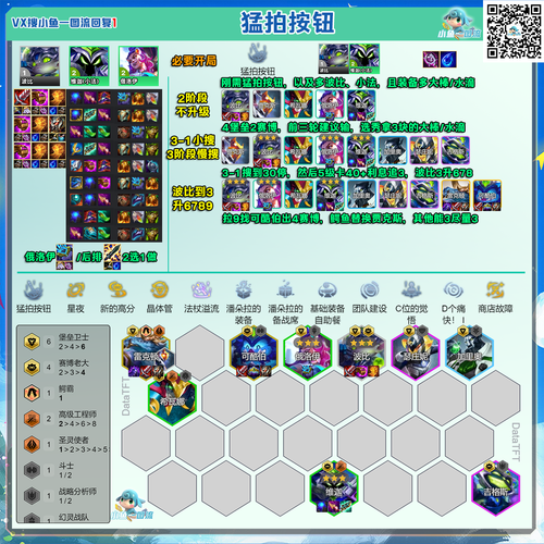 〖Four〗、开局策略:刚需开局使用“猛拍按钮”符文,2阶段不升级,专注于凑齐六堡垒和小法。中期运营:在3-1阶段搜点到30金币停手,以便在3-2阶段自然升级到5级。追3星:在3-2阶段卡40~50金币,利用利息追3星波比、维迦、俄洛伊或希瓦娜。波比到3星后可以先升级,最迟在4阶段将波比追到3星。