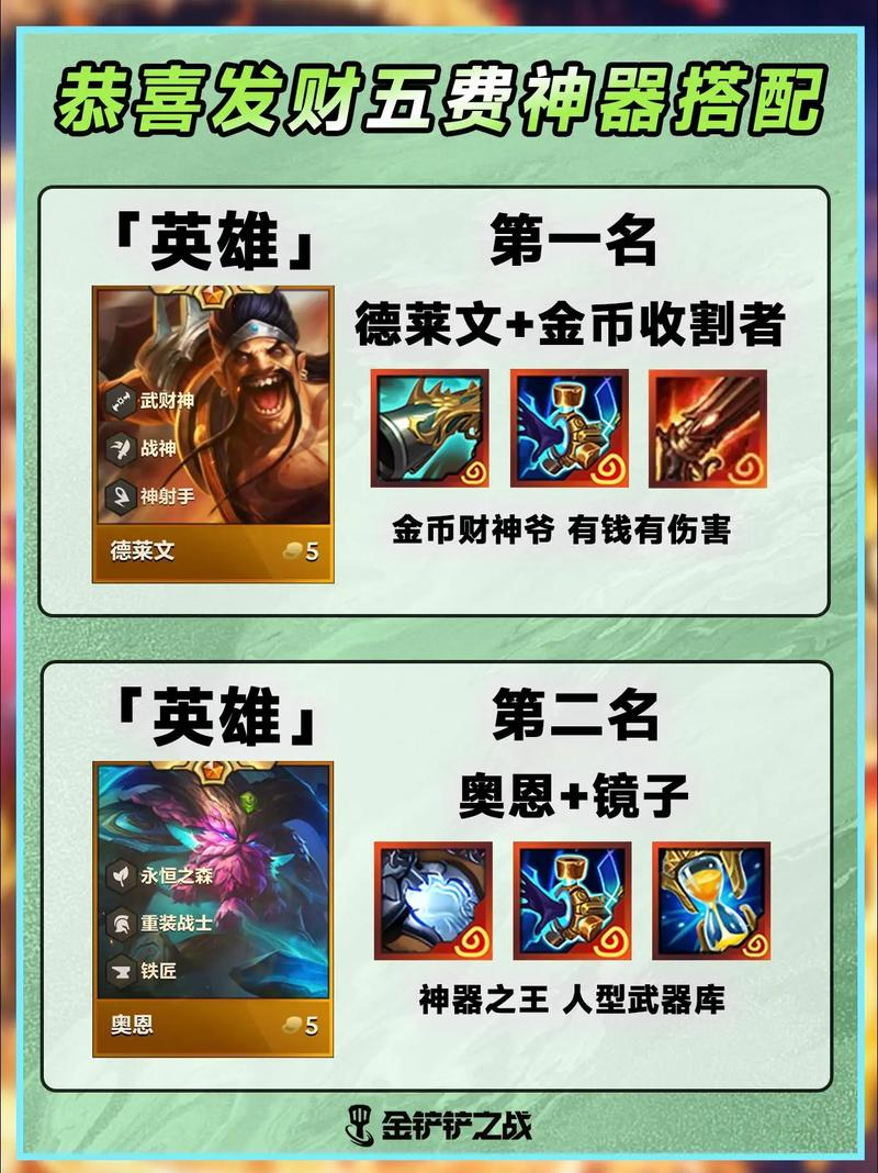 在金铲铲之战的恭喜发财福星模式中,奥恩神器的搭配推荐如下:中娅悖论:推荐理由:提供双抗和保命功能,是三星五费英雄的必备神器之一,适合瞎子、万豪、永恩等五费英雄。