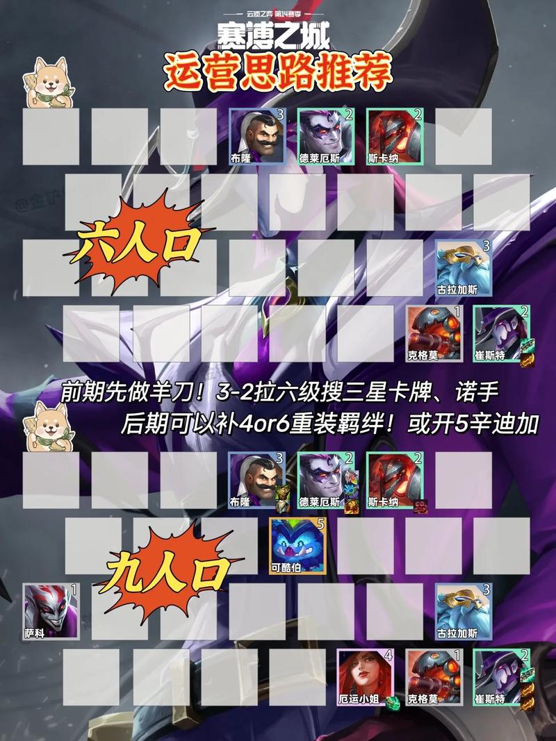 〖Four〗、关键阵容搭配:5战神,3福星,2重装,2刺客。必备英雄包括派克、卡特、诺手、猪妹、奥拉夫、锐雯、奥恩、螃蟹、德莱文、奇亚娜。阵容优势:这些英雄能形成一个强大的阵容,彼此之间有着很好的配合,有效打击敌人核心单位。 推荐装备搭配 奥恩:镜子、振奋、光盾。增强生存能力,承担前排角色。