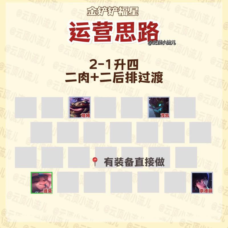 〖Two〗、主坦妮蔻:日炎斗篷、狂徒铠甲、石像鬼石板甲。这些装备提供坦度和抗性,让妮蔻能够扛住更多伤害。运营策略 前期:以玉龙羁绊为核心,利用奈德丽进行过渡。优先合成鬼索的狂暴之刃和水银,确保蜘蛛的输出和控制能力。中期:在3-2阶段拉6人口,寻找2星蜘蛛和开启2幽影羁绊。