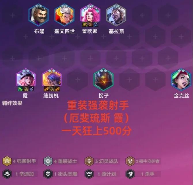 〖Three〗、德玛西亚皇子-嘉文四世暗夜猎手-薇恩迅捷斥候-提莫放逐之刃-锐雯沙漠皇帝-阿兹尔狂野女猎手-奈德丽戏命师-烬暴走萝莉-金克丝其中,天选之人需为神射手。阵容羁绊:6神射手3三国猛将2神盾使2灵魂莲华夜幽装备推荐:金克丝:朔极之矛、水银、鬼索的狂暴之刃、电刀。