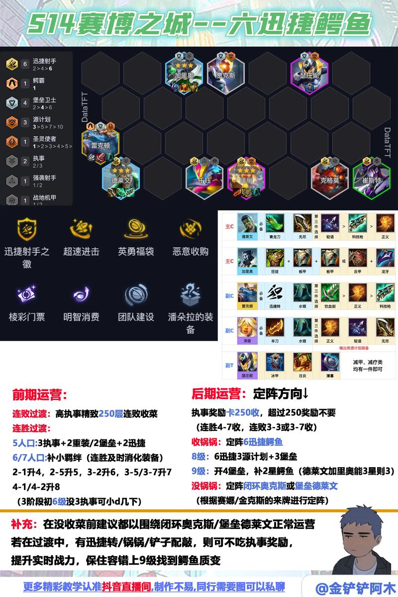 〖Six〗、金铲铲之战迅捷射手玩法攻略 阵容羁绊 迅捷射手阵容核心包括卡莎、女枪、EZ、莫甘娜(后排)、龙龟、芮尔、盖伦(前排)。羁绊组合为3迅捷射手、2星守护者、2护卫。其中,卡莎必须追三星,主坦克龙龟也尽量追三星,若龙龟无法三星,则可用盖伦作为主坦克。