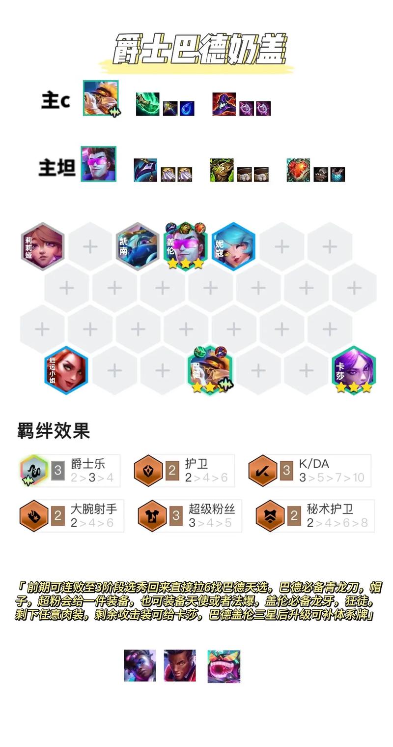 一费卡:奎桑提、莉莉娅二费卡:盖伦、萨勒芬妮三费卡:莫德凯撒、艾克四费卡:阿狸、布里茨五费卡:娑娜主要羁绊:6秘术护卫3法师3KDA装备推荐:主C阿狸:蓝buff或朔极之矛必备,第二件优先科技枪,第三件法系输出装(如纳什之牙)。主坦布里茨:离子火花和通用肉装(如狂徒、坚定之心、冠冕)。