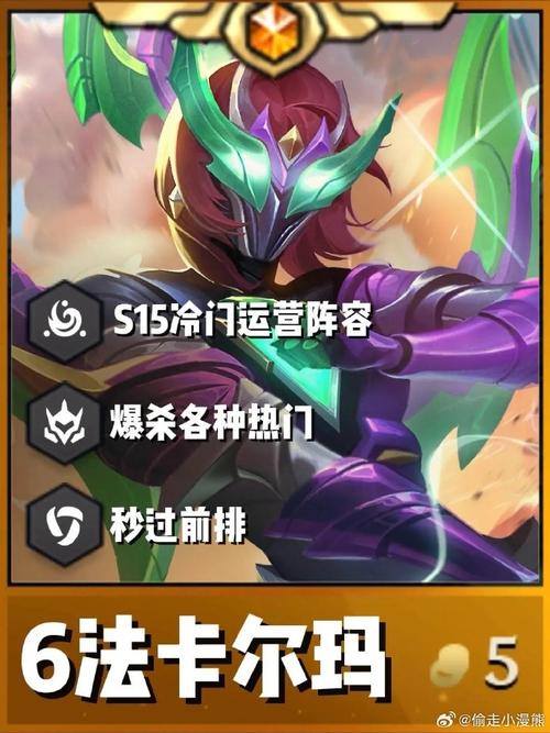 〖Three〗、金铲铲之战S7赌卡尔玛的玩法如下:阵容选取 核心英雄:卡尔玛、曙光、宝石、寒冰、布隆、石傲玉以及腕豪。 阵容特点:利用卡尔玛的高爆发输出,配合前排肉盾英雄的保护,形成强大的战斗力。装备搭配 卡尔玛:核心装备为蓝BUFF,提供技能冷却缩减,使卡尔玛能更频繁地释放技能。