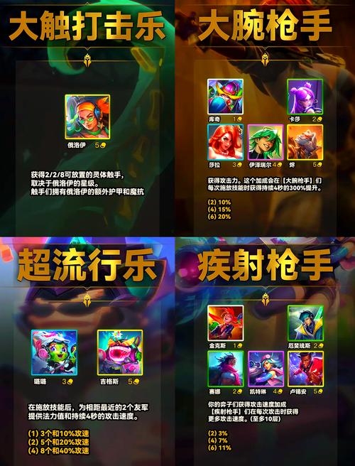 并肩作战:回归羁绊,强调团队合作和羁绊搭配。迪斯科宇航员:在战场上释放闪耀的灯球,为附近队友提供攻速和治疗,增强团队的续航能力。乡村音乐:召唤类型的羁绊,当血量掉到一定程度会召唤赫卡里姆进场,提供额外的战斗力。电子舞曲:全员可以变成同样的单位,释放同样的技能,适合喜欢统一作战风格的玩家。