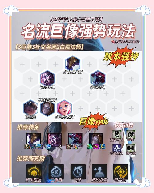 〖One〗、《金铲铲之战》中社交名流阵容的搭配思路主要有以下几种:宗师瑞兹阵容阵容组成:可酷伯、乌迪尔、亚索、赛娜、皇子、瑞兹、盲僧,形成4大宗师3裁决3战队2主宰2司令2斗士的羁绊。核心玩法:4宗师提供控制与减益,皇子大招配合瑞兹单点爆发快速减员。需通过连胜或经济强化积累资源,刷出社交名流果实可显著提升强度。