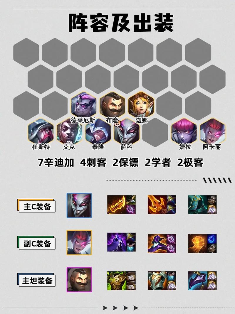 英雄:阿卡丽、艾克、萨科(小丑)、卡特琳娜、婕拉、德莱厄斯、迦娜、布隆。羁绊:5辛迪加、4刺客、2极客、2保镖、2学者。装备分配 主C萨科(小丑):鬼索的狂暴之刃、无尽之刃、守护天使。备选装备为火炮、饮血剑。副C布隆:狂徒铠甲、石像鬼的板甲、龙爪等肉装。