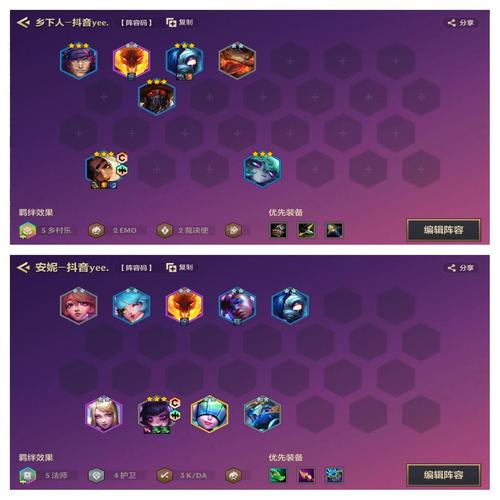 〖One〗、强势上分阵容推荐 秘术+神射轮子妈 这套阵容非常容易凑齐,且强度较高。开局拿神射手天选,然后开始拿其它羁绊牌。关键是要早拉7级刷出神射手轮子妈,并尽快将其升至三星。同时,也要注意拿三星刀妹作为前排抗伤害。上了三星轮子妈+三星刀妹后,在四阶段基本能保持连胜。后续可以攒钱上8上9,补充锤石和永恩等英雄。