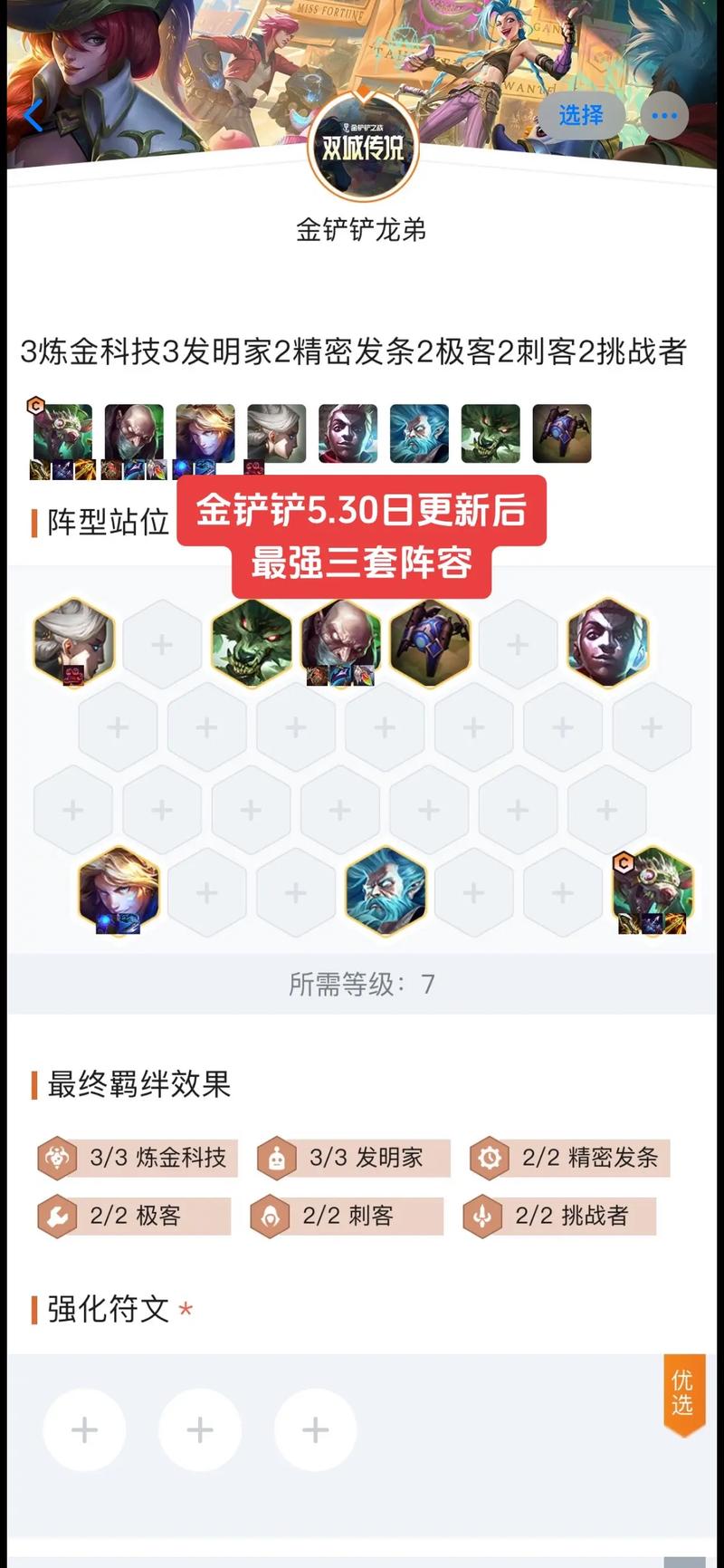 〖Four〗、阵容推荐一 阵容成员:希维尔、牛头、斯维因、卢锡安、蔚、瑟庄妮、嘉文四世。阵容羁绊:6海克斯科技2执法官2格斗家2强袭战士1宿敌。阵容推荐二 阵容成员:泰达米尔、扎克、烈娜塔、沃里克、维克托、杰斯、蔚、希尔科。阵容羁绊:5炼金科技2执法官2挑战者2学者2格斗家1宿敌1微光首脑1未来守护者。