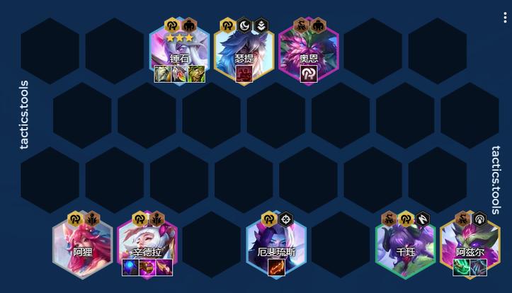 〖Three〗、阵容构成 在金铲铲之战S11赛季中,永森辛德拉阵容的核心成员包括:阿狸、千珏、纳尔、锤石、奥恩、辛德拉、安妮、沙皇以及瑟提。这套阵容兼具输出与控制,能够在战斗中发挥出强大的综合实力。