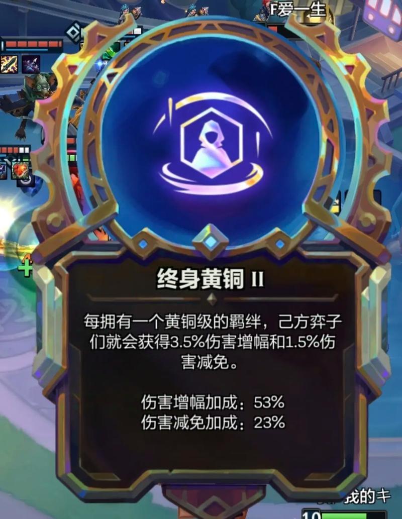 《金铲铲之战》终身黄铜海克斯玩法攻略 海克斯介绍与效果 终身黄铜 I:每拥有一个黄铜级羁绊,己方弈子就会获得3%伤害增幅。终身黄铜 II:每拥有一个黄铜级羁绊,己方弈子就会获得5%伤害增幅和5%伤害减免。