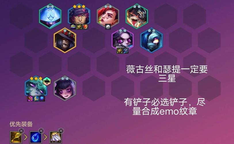 阵容构成 核心羁绊:4EMO、6舞者、2护卫。EMO和舞者羁绊能够提供额外的攻击速度和法术强度,而护卫羁绊则增加护甲,提升前排坦度。