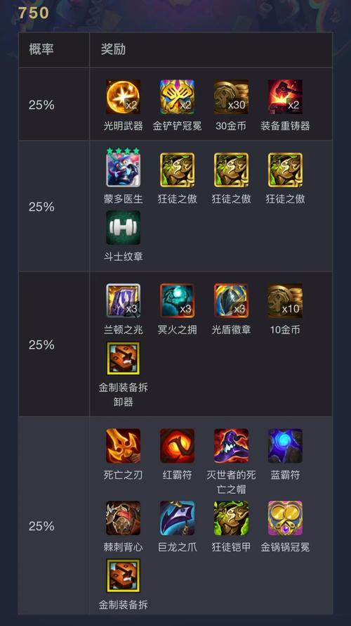 - 649层:两个辅助假人/1饮血剑 + 1冕卫 + 1个二星可酷伯 + 1个二星吉格斯 + 1个无终恨意/三星德莱文 + 三星加里奥 + 1个巨像的传承。650 - 699层:3个杰作升级 + 2个成装锻造器/1光明冕卫 + 1死舞 + 2圣杯 + 1二星小法/50次刷新 + 100金币。