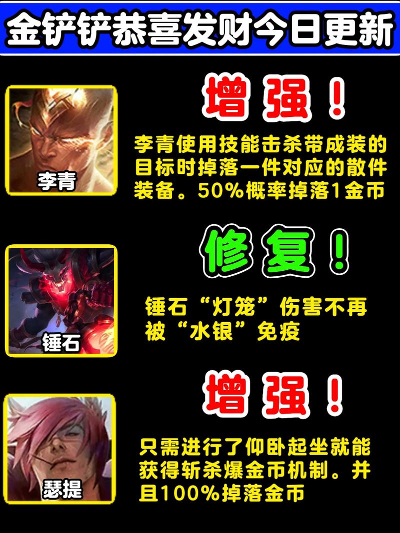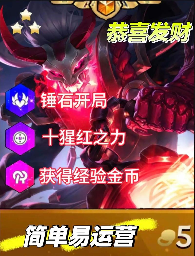 技能强化:在该模式中,德莱文和锤石的技能获得了强化。德莱文的强化技能将提供更为强大的输出能力,而锤石的强化技能则能够为玩家带来更多的战利品和经济收益。总结 天选福星恭喜发财模式的回归将为《金铲铲之战》的玩家带来全新的挑战和乐趣。