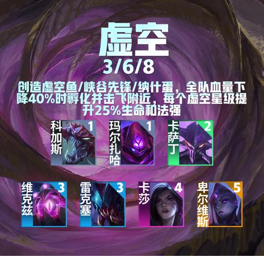 羁绊效果 虚空羁绊的核心效果在于其独特的孵化机制。当全队失去40点生命值时,会根据当前场上虚空单位的数量触发不同的孵化效果:2虚空:虽然基础效果并未直接提及,但通常这样的羁绊设定是为了后续更高数量的虚空单位做铺垫,可能隐含着一些基础属性或能力加成。4虚空:会孵化出3个虚空召唤鱼。