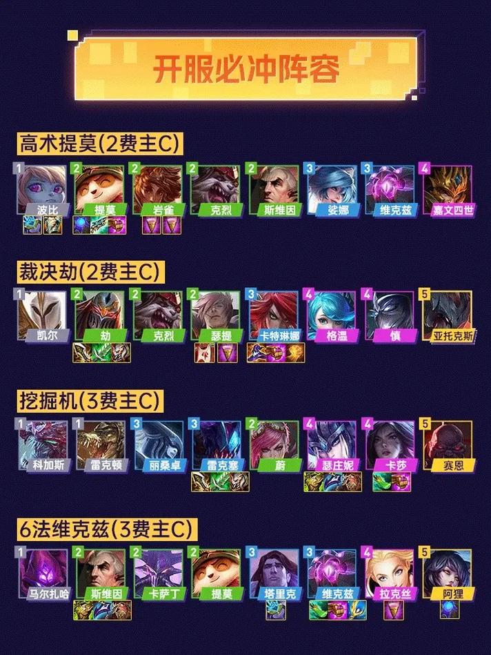 第一套阵容:烬、寒冰、诺手、乌鸦、卡特、塞恩、铁男、霞。这是一套较为均衡的阵容,拥有不错的输出与控制能力。第二套阵容(剑魔来的早且无珠光莲花):剑魔、诺手及其他适配英雄。这套阵容依赖剑魔的控制与诺手的输出。第三套阵容(7人口瑟提3星):瑟提、诺手及其他高费卡。