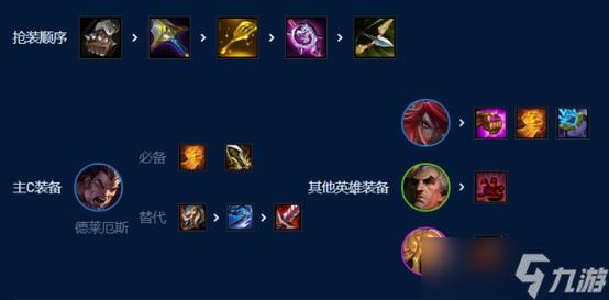 《金铲铲之战》S5暴扣诺手搭配及玩法攻略:装备搭配 核心装备:正义、暗夜收割者、狂徒。这三件装备能显著提升德莱厄斯的生存能力和输出伤害。次要装备:冰甲、破甲。冰甲提供控制效果,破甲则增强对敌方前排的威胁。装备优先级:优先保证德莱厄斯的装备,确保其核心输出和生存能力。