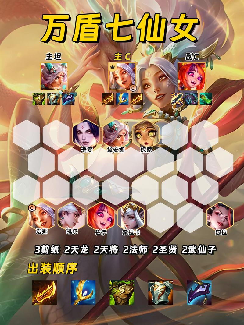 〖Two〗、九五彗阵容 核心英雄:彗星(龙王)、安妮、孙悟空等。羁绊组合:主要依赖2天神、2武仙、2重骑兵等羁绊组合,形成强大的战斗体系。装备推荐:龙王作为核心,建议堆叠法师输出装,如法师帽、炽天使之拥、珠光护手或青龙刀,以提升其法术伤害能力。 天龙索拉卡阵容 英雄构成:卡兹克、墨菲特、妮蔻等。