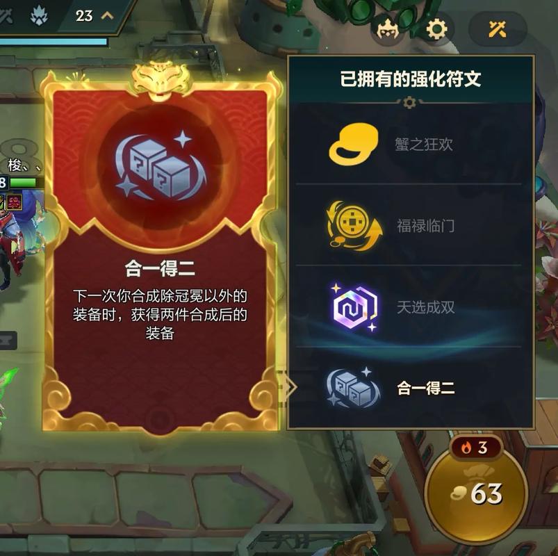 〖Three〗、窃贼帮派:能够提供额外的装备和金币,极大增强前期战斗力。新人入队:为队伍提供额外的英雄,增加阵容灵活性和战斗力。升级咯:快速升级人口,提高阵容上限。前进之路:提供额外的经验值,加速升级过程。羽量级III:为低费卡提供额外攻速,适合赌狗阵容。短兵III:增加前排攻击力,提升战斗效率。