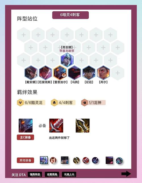 运营节奏:在21阶段升至四人口时,根据实际情况选取护卫+怒翼龙或护卫+迅捷射手进行搭配。在后续阶段,根据血量和经济情况,适时升至七人口或八人口,并进行大搜索以提升阵容质量。阵容站位: 防刺客:防刺客的站位策略尤为重要,需要合理安排站位,确保核心输出位置得到保护。