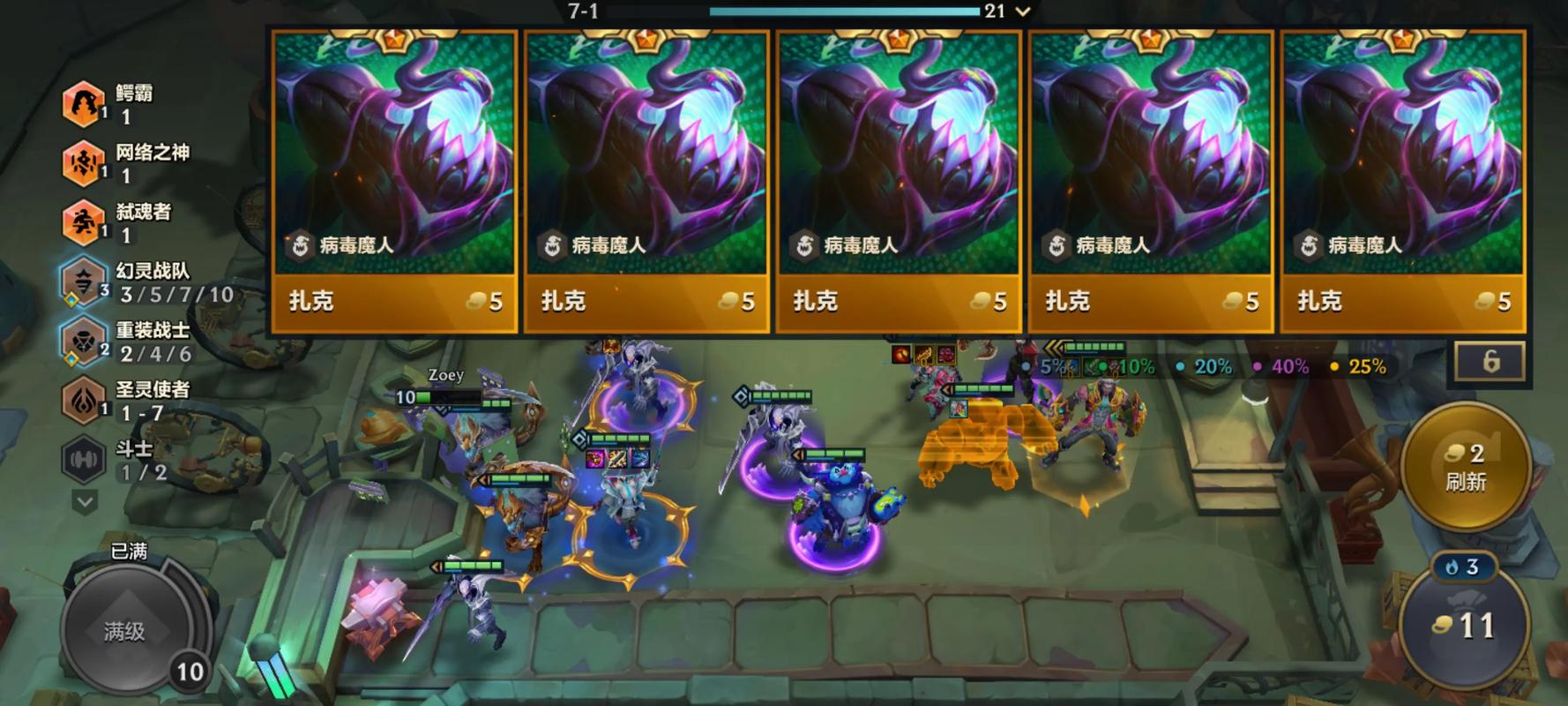 〖Four〗、阵容组成 核心英雄:诺手、卡牌、蝎子、布隆、酒桶、小丑、大嘴、女枪该阵容以辛迪加羁绊为核心,通过高爆发和控制能力在战场上占据优势。羁绊组成 5辛迪加:提供强大的单体和群体伤害能力,以及额外的生命值和法力值回复。2斗士:增加前排英雄的坦度和输出能力。
