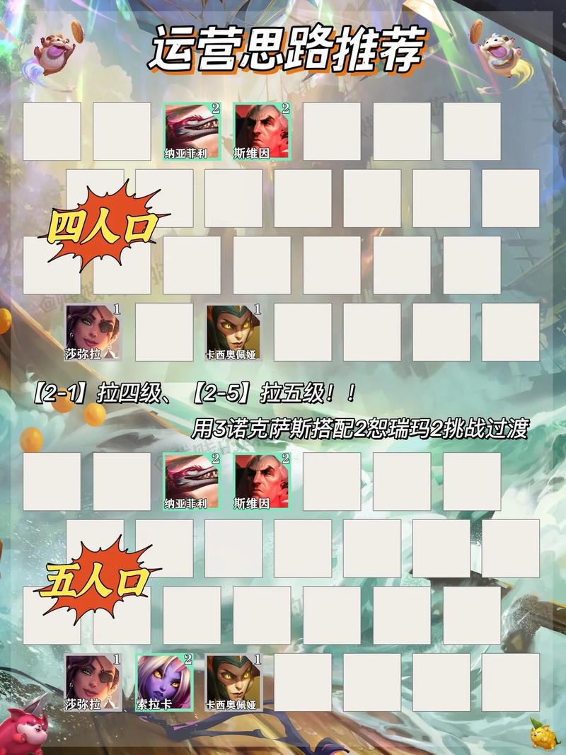 〖Four〗、佛耶戈:必备机甲转职,第二件装备建议续航装(科技枪刃或汲取剑),第三件装备建议离子火花或泰坦的坚决。费德提克:多余法强装,如离子火花等。蕾欧娜:坦度装备,如龙牙、荆棘背心、救赎等。阵容打法 前期过渡:2-1升4人口,2-5升5人口。