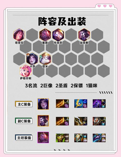 金铲铲之战名流卡莎阵容组建及玩法介绍:阵容搭配 阵容组成:塞恩、加里奥、迦娜、卡莎、萨勒芬妮、塔里克、悠米。阵容羁绊:3名流、2学者、2巨像。这套阵容以名流羁绊为核心,搭配巨像提供前排坦度,学者增加回蓝速度。装备搭配 卡莎:大天使之杖(核心装备,增加法强)、羊刀(叠加攻速)、复活甲(防止暴毙)。