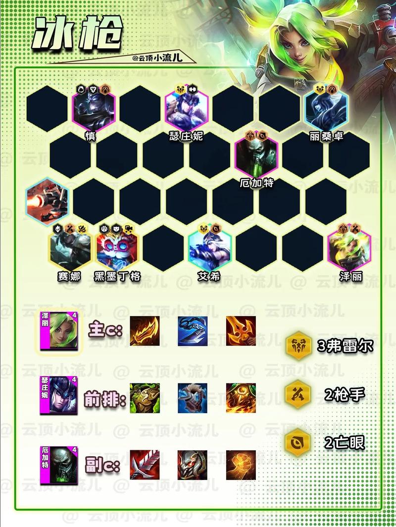 经济效率:考虑到成型速度与使用金币的效率。推荐阵容解析 1 精密刺客 核心英雄:卡莉丝塔、佐伊、阿卡丽 阵容构建:刺客通常需要速战速决,快速解决后排重要输出或治疗单位。卡莉丝塔作为关键输出,需要尽早升至2星并配置物理攻击与攻速装备,如无尽之刃和幽梦之灵。