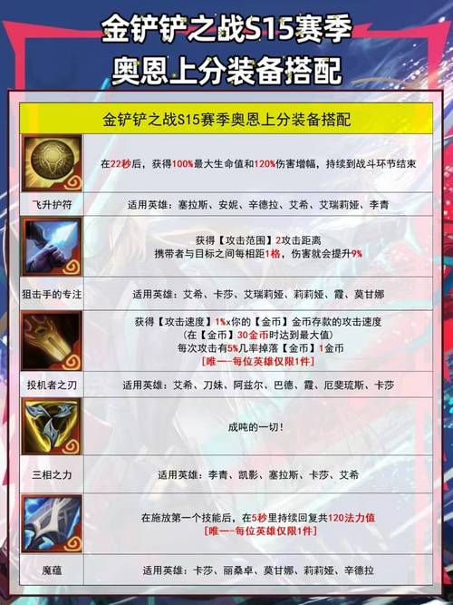 〖Two〗、金铲铲之战S15赛季推荐的上分阵容有机甲4宗师阵容、格温永恩95阵容、逐梦奥德赛阵容、圣盾狙神阵容以及至高天九五阵容。机甲4宗师阵容:特点:该阵容在新赛季上线前未被削弱,拥有长达4秒的锁蓝效果,可以很好地控制敌人,为队友创造输出环境。适用场景:适合在需要控制敌人以获取战斗优势的情况下使用。