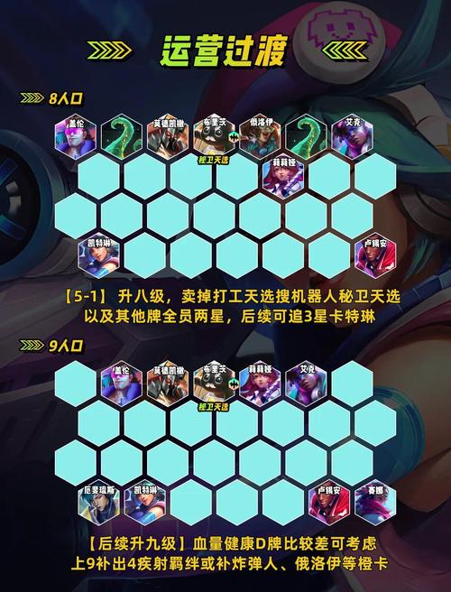 〖Two〗、第一套阵容:烬、寒冰、诺手、乌鸦、卡特、塞恩、铁男、霞。这是一套较为均衡的阵容,拥有不错的输出与控制能力。第二套阵容(剑魔来的早且无珠光莲花):剑魔、诺手及其他适配英雄。这套阵容依赖剑魔的控制与诺手的输出。第三套阵容(7人口瑟提3星):瑟提、诺手及其他高费卡。