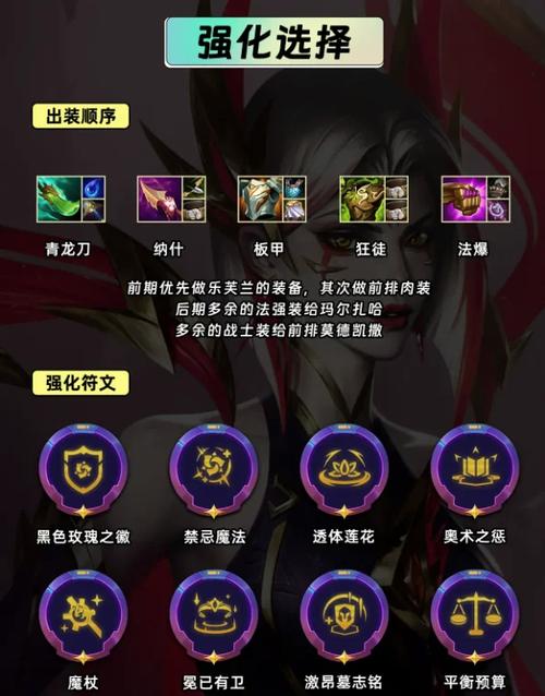 〖Four〗、装备选取与搭配 黑玫瑰:优先考虑法术强度和生命值加成装备,如“鬼书”(莫雷洛秘典)、“灭世者之帽”等,以提升其输出能力和生存能力。蚂蚱:着重于防御类装备,如“狂徒铠甲”、“荆棘之甲”,以增加其生存能力。