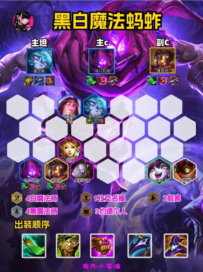 〖One〗、阵容核心英雄与羁绊组合核心英雄包括莫甘娜、吸血鬼、努努、蜘蛛、大头、盖伦、妖姬和蚂蚱(马尔扎哈),备选英雄为杰斯。羁绊搭配需满足以下条件:4先知:提供魔法抗性并增强输出能力。4黑玫:激活强力黑玫加成,提升整体法术强度。2双形:增强阵容灵活性,适应不同对局需求。2格斗:增加前排坦度,为后排输出创造空间。