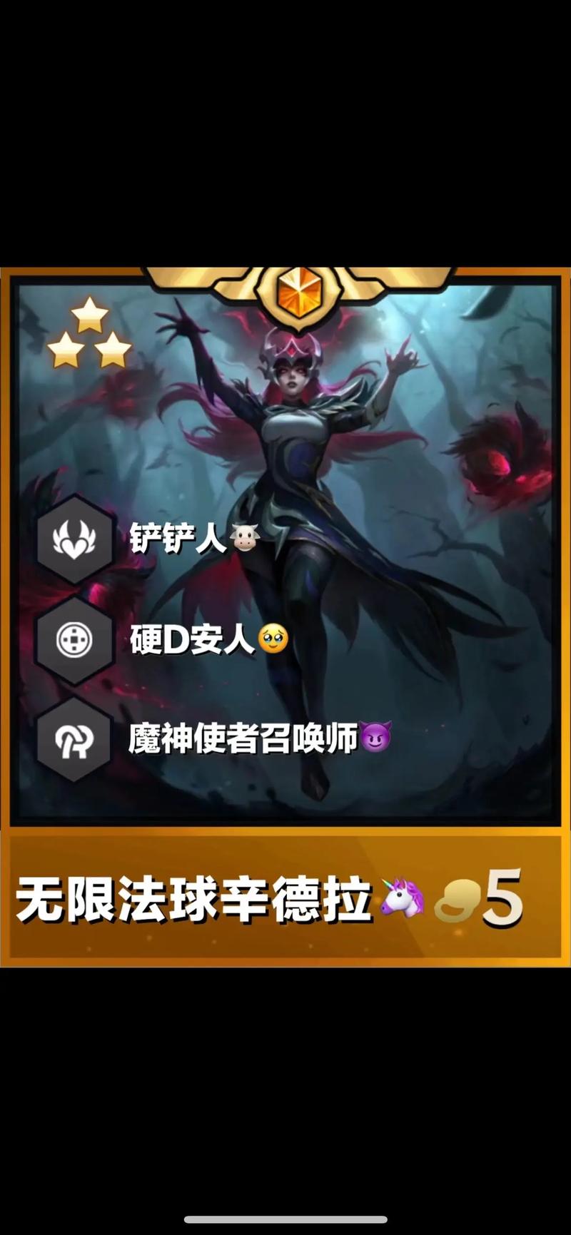 〖Three〗、玩法建议 辛德拉作为阵容的核心,需要尽早合成适合她的装备,如蓝霸符、珠光护手等。在阵容成型后,注意调整站位,保护辛德拉等核心输出英雄,避免被敌方集火。合理利用执事和黑魔法师的羁绊效果,提升阵容的整体实力。