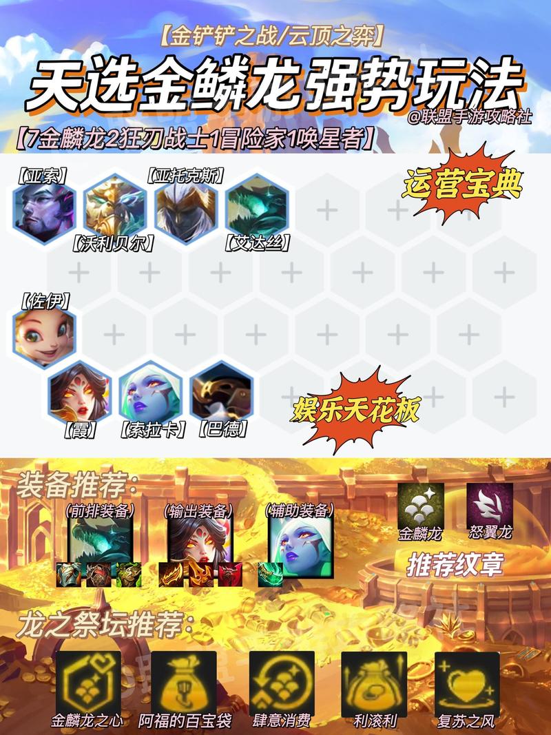 〖Two〗、金鳞龙转职合成 合成公式:金铲铲+大剑=金鳞龙转职。金鳞龙羁绊效果 羁绊数量:3/5/7/9。羁绊效果:提供X件专属的随机【金鳞】装备。『3』 1件独特装备。『5』 2件独特装备。『7』 3件独特装备。『9』 5件独特装备,包括[群英冠冕]。幻境永恩阵容搭配思路 玩法核心:连胜速6。