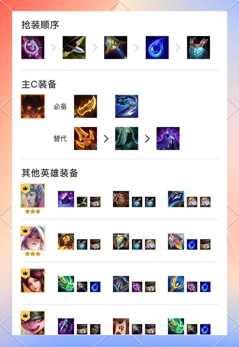 〖Three〗、阵容组成:通常包括吉格斯、艾克、维克托、大头、烬、塔姆、杰斯和蔚等英雄。阵容优势:拥有高爆发和高控制,烬在7发明阵容中的输出强度极高。玩法要点:尽快凑齐7发明羁绊,提升烬的装备和星级,确保输出稳定。