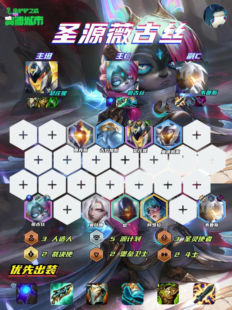 不屈战神/华剑战姬:作为阵容前排,他们通常需要携带救赎、反甲、狂徒、日炎等装备来提升生存能力和控制能力,为薇恩创造更好的输出环境。副C装备推荐:双枪女帝:作为副C,双枪女帝可以携带青龙刀、鬼书、剑转、水印等装备来提升其技能释放频率和输出能力,与薇恩形成有效的输出联动。
