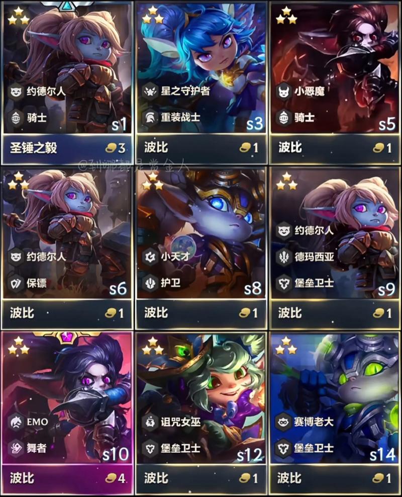 〖Three〗、前期(1-3阶段):开局刷到猛拍按钮就玩这套阵容,拿波比和小法走连败,用低费卡凑2堡垒卫士过渡,保证每回合吃50金币利息。中期(3-4阶段):3-1阶段花20金币搜牌,找波比、小法、俄洛伊等升两星,重点追三星波比。4阶段前务必三星波比,之后攒钱拉人口。