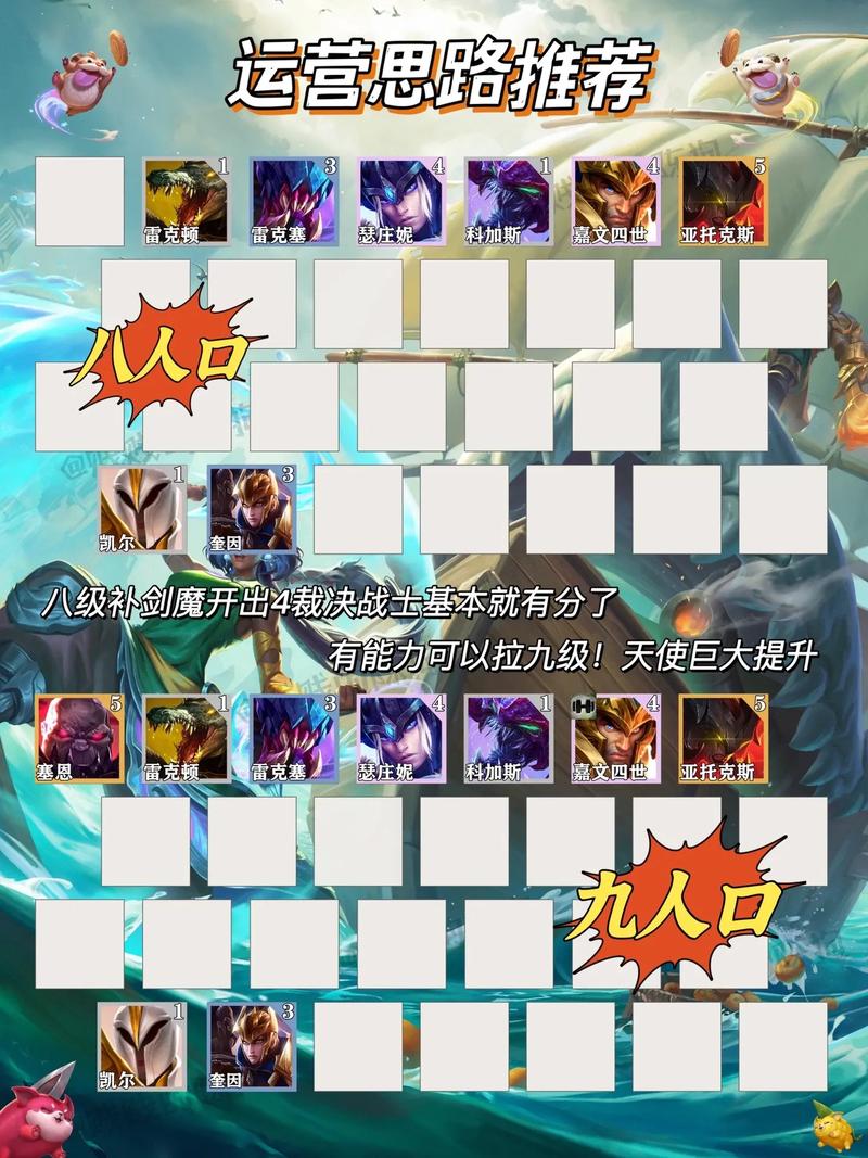 〖Two〗、- 早期以鳄鱼和蛇女过渡,利用蛇女携带奶妈装备,鳄鱼携带乌鸦装备。- 注意观察以绪塔尔的格子,合理搭配前排和后排的阵容。中期运营**:- 在2-4阶段选秀时,优先选取与战力相关的海克斯。- 5人口时根据手牌选取合适的英雄过渡,等待奶妈和乌鸦的三星。